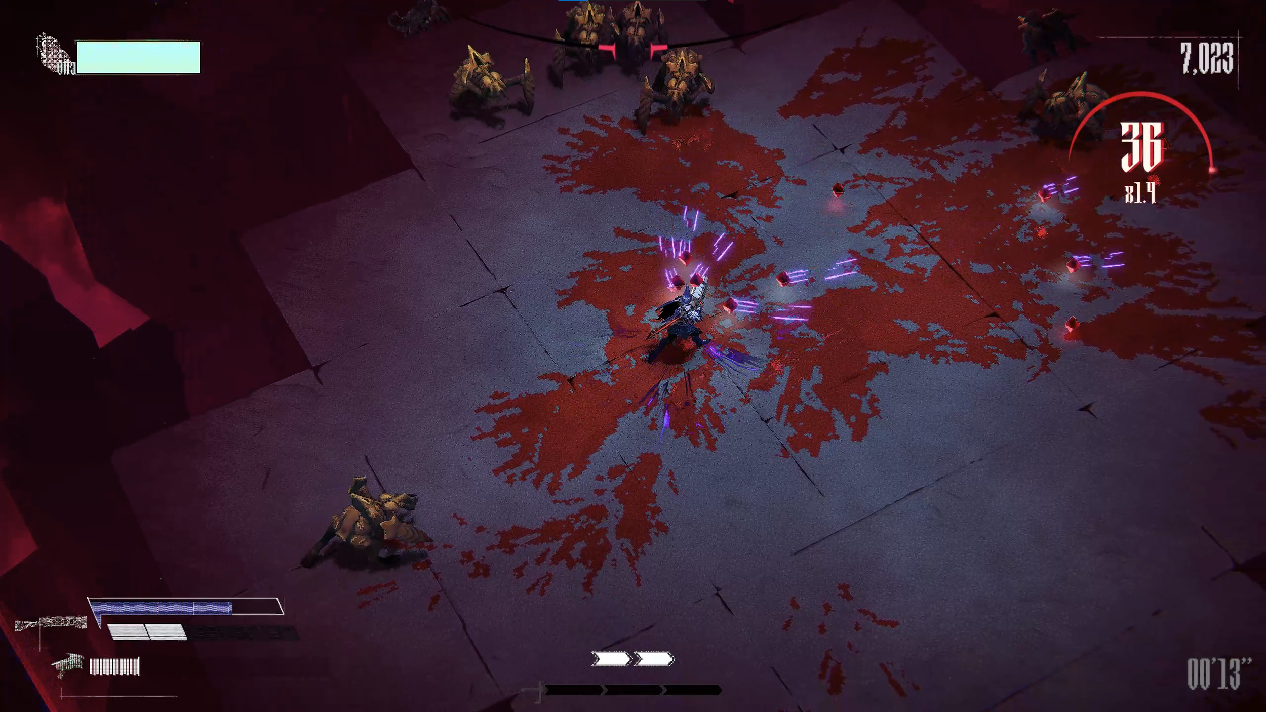 Absorbing (known as Wrath Absorbing) blood gems into the Heavy Weapon would fill its Wrath Bar and once full, a Wrath Burst could be performed. This was a devastating attack that dealt significant damage and caused enemies hit and killed by it to drop Health Shards. If enemies survived the attack, they would be placed into an Inflictum state that slowed their movement and attack speed temporarily. This became the player’s main method of regaining health and dealing with tough & large swarms of enemies.